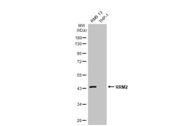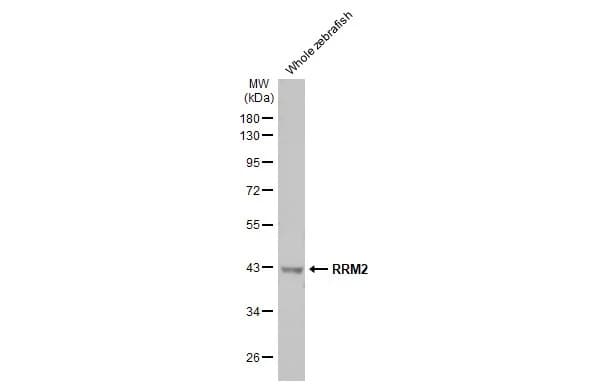 Rabbit Recombinant Monoclonal RRM2 antibody. Carrier free. Suitable for ICC/IF, WB, IHC-P and reacts with Human, Zebrafish samples. Immunogen corresponding to Recombinant Fragment Protein within Human Ribonucleoside-diphosphate reductase subunit M2.