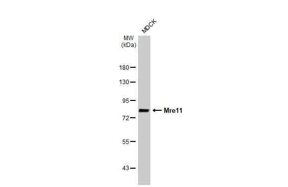 Rabbit Recombinant Monoclonal MRE11 antibody. Carrier free. Suitable for IHC-P, ICC/IF, WB and reacts with Human, Dog, Mouse, Rat samples. Immunogen corresponding to Recombinant Fragment Protein within Human MRE11.