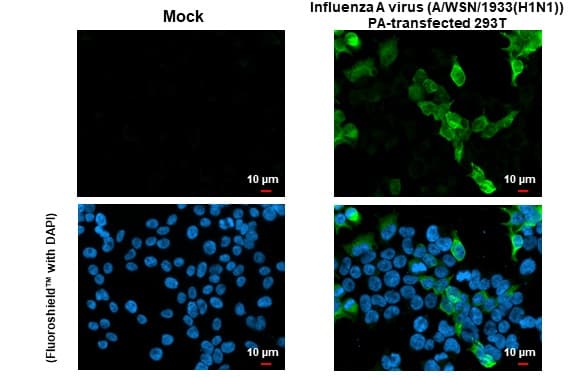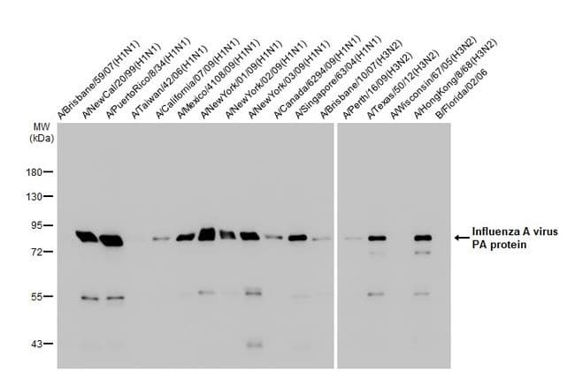 Rabbit Recombinant Monoclonal Influenza A virus PA protein (A/WSN/1933(H1N1)) antibody. Carrier free. Suitable for ICC/IF, WB and reacts with Transfected cell line, Purified native protein samples.