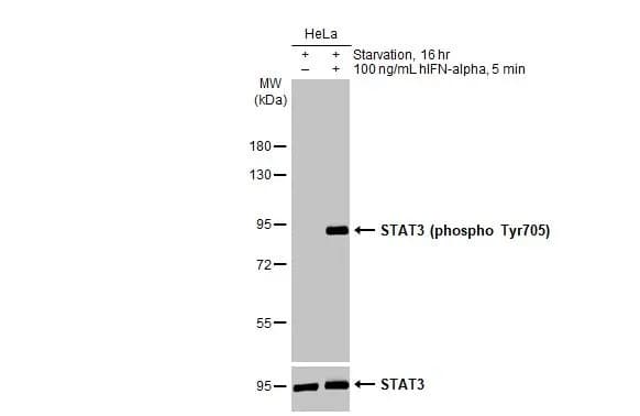 Rabbit Recombinant Monoclonal STAT3 phospho Y705 antibody. Carrier free. Suitable for WB and reacts with Human, Rat samples. Immunogen corresponding to Synthetic Peptide within Human STAT3 phospho Y705.