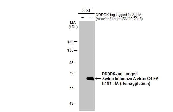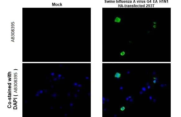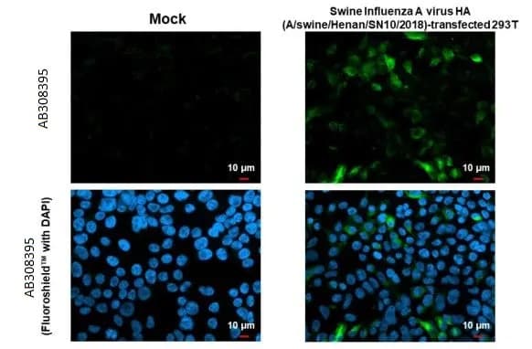 Rabbit Recombinant Monoclonal Swine Influenza A virus G4 EA H1N1 HA (Hemagglutinin) (A/swine/Henan/SN10/2018) antibody. Carrier free. Suitable for IHC-P, ICC/IF, WB and reacts with Transfected cell line samples.