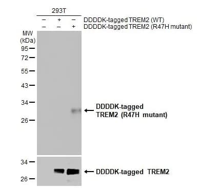 Rabbit Recombinant Monoclonal TREM2 mutated R47H antibody. Carrier free. Suitable for WB and reacts with Transfected cell line samples. Immunogen corresponding to Synthetic Peptide within Human Triggering receptor expressed on myeloid cells 2 mutated R47H conjugated to Keyhole Limpet Haemocyanin.