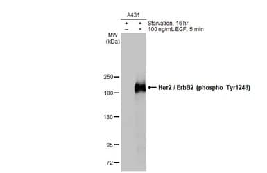 Rabbit Recombinant Monoclonal ErbB2 / HER2 phospho Y1248 antibody. Carrier free. Suitable for IHC-P, WB and reacts with Rat, Human samples. Immunogen corresponding to Synthetic Peptide within Human ERBB2 phospho Y1248 conjugated to Keyhole Limpet Haemocyanin.