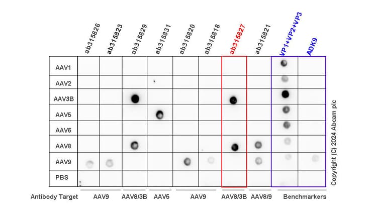 Mouse Recombinant Monoclonal AAV8 antibody. Suitable for I-ELISA, Dot and reacts with Recombinant fragment - Adeno-associated virus 3B, Recombinant fragment - Adeno-associated virus - 8 samples.