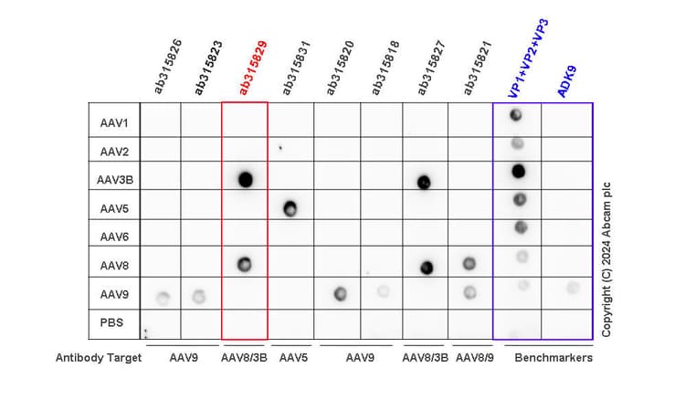 Mouse Recombinant Monoclonal AAV8 antibody. Carrier free. Suitable for I-ELISA, Dot and reacts with Recombinant fragment - Adeno-associated virus 3B, Recombinant fragment - Adeno-associated virus - 8 samples.
