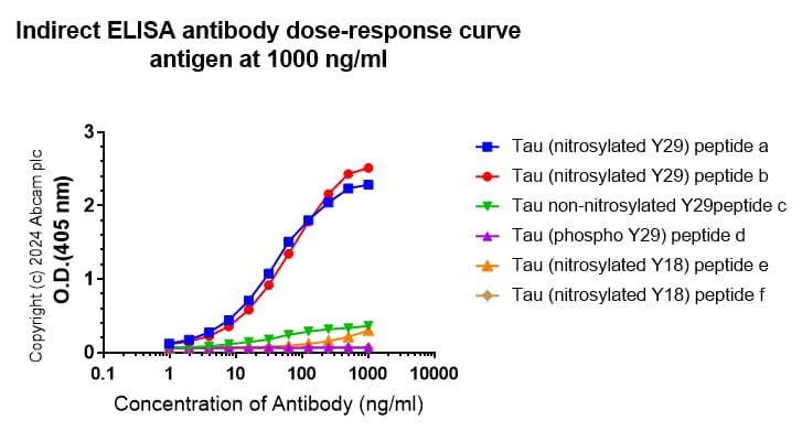 Rabbit Recombinant Monoclonal TAU nitrosyl Y29 antibody. Suitable for WB, I-ELISA, Dot and reacts with Transfected cell lysate - Human, Synthetic peptide - Human samples.