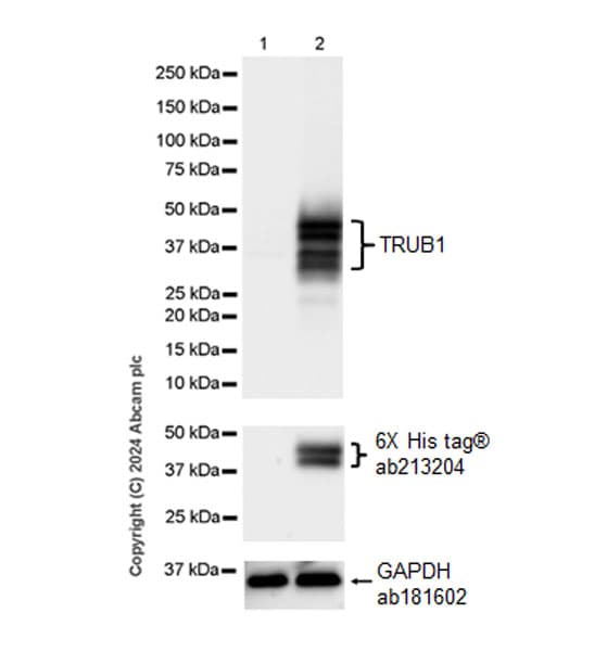 Rabbit Recombinant Monoclonal TRUB1 antibody. Suitable for WB and reacts with Transfected cell lysate - Human, Human samples.