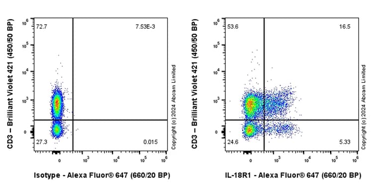 Rabbit Recombinant Monoclonal IL-18R1 antibody - conjugated to Alexa Fluor® 647. Suitable for Flow Cyt and reacts with Human samples.