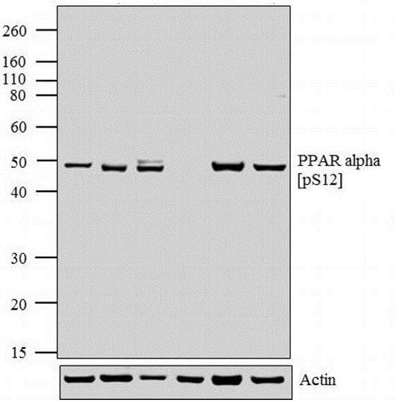 Rabbit Polyclonal PPAR alpha phospho S12 antibody. Suitable for ICC/IF, WB and reacts with Mouse, Human samples. Cited in 36 publications. Immunogen corresponding to Synthetic Peptide within Mouse Peroxisome proliferator-activated receptor alpha phospho S12 aa 1-50.