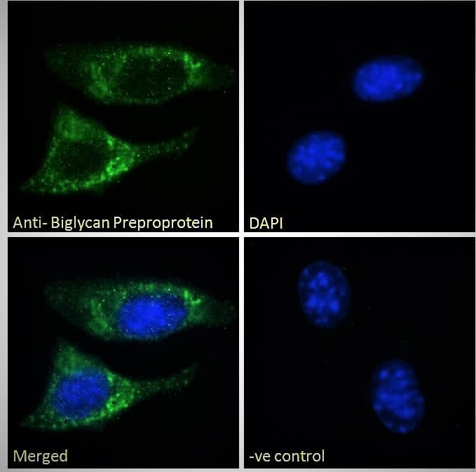 Goat Polyclonal Biglycan antibody. Suitable for ICC and reacts with Mouse, Human samples. Cited in 22 publications. Immunogen corresponding to Synthetic Peptide within Human Biglycan aa 350 to C-terminus.