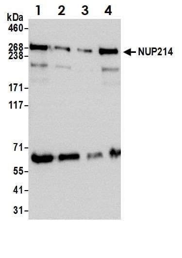 Rabbit Polyclonal NUP214 antibody. Suitable for IHC-P, ICC, IP, WB, ICC/IF and reacts with Human, Mouse samples. Cited in 19 publications. Immunogen corresponding to Synthetic Peptide within Human Nuclear pore complex protein Nup214.