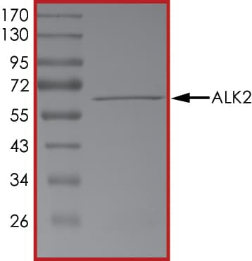 Recombinant human Activin Receptor Type IA protein is a Human Fragment protein, in the 147 to 509 aa range, expressed in Baculovirus infected Sf9, with >90% purity and suitable for SDS-PAGE, WB, FuncS.