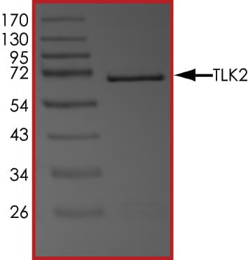 Recombinant human TLK2 protein is a Human Fragment protein, in the 388 to 772 aa range, expressed in Baculovirus infected Sf9, with >90% purity and suitable for SDS-PAGE, WB, FuncS.