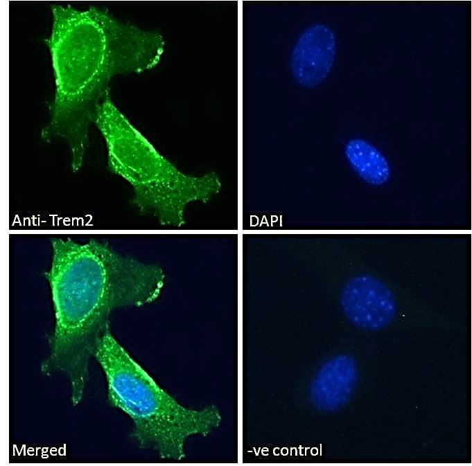 Goat Polyclonal TREM2 antibody. Suitable for ICC and reacts with Mouse samples. Cited in 8 publications. Immunogen corresponding to Synthetic Peptide within Mouse Trem2 aa 150-200.