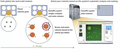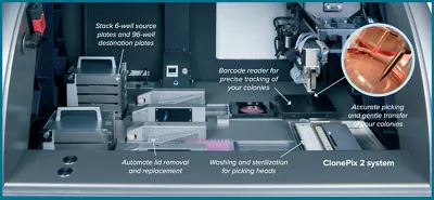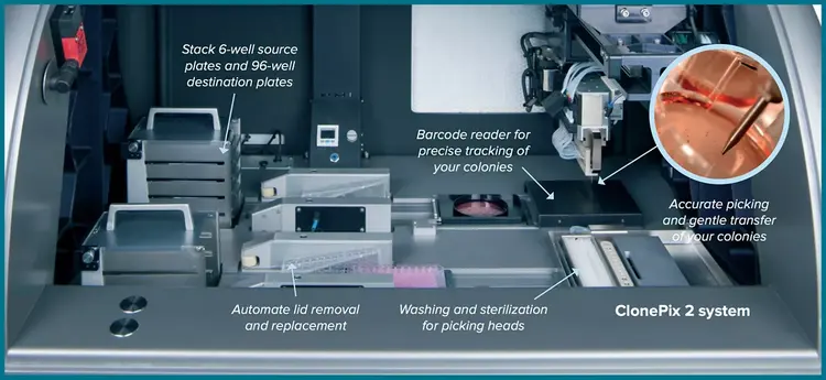 The ClonePix® 2 Mammalian Colony Picker is a fully automated system for selecting high-value clones used in antibody discovery and cell line development. Screen more clones in less time with monoclonal verification on day zero, then screen and identify for highest producers in weeks, not months.