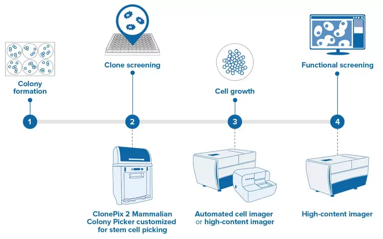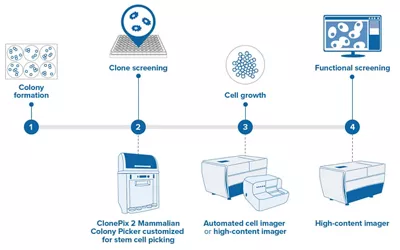 - Clone screening - Clonally-derived stem cell colonies are identified by their desirable morphological characteristics and are picked from the low-density 6-well plates into higher density 96-well plates to carry forward with the screening. The ClonePix® 2 Mammalian Colony Picker can be customized with high-resolution optics and stem cell-specific pins, allowing this established technology to be leveraged in stem cell workflows.