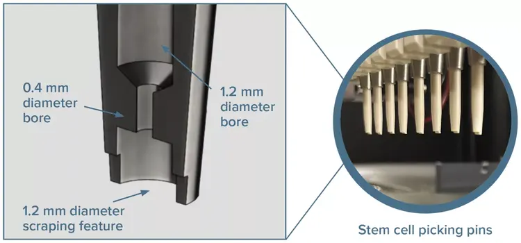 High-resolution imaging identifies desirable, clonal stem cell colonies for high-throughput colony screening and picking. Specialized picking pins allow the gentle transfer of adherent, feeder-free cells to high-density plates for clonal expansion and downstream analysis.